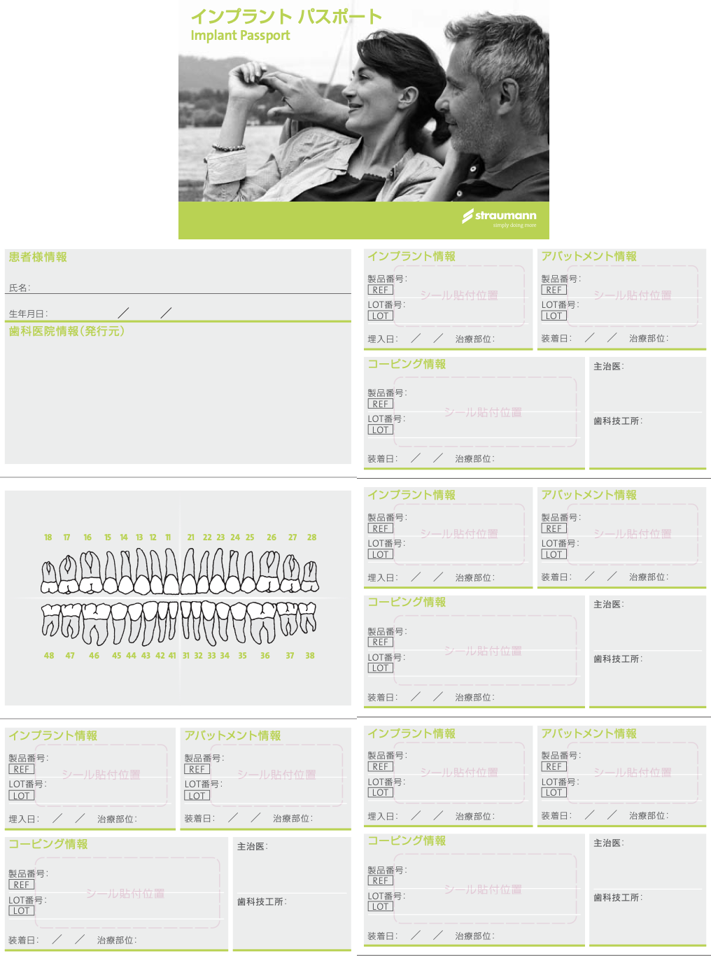 インプラント治療をした患者さんがのちのち困るのは、いつどこでどんな治療をしたのか分からなくなってしまうことです。そのようなことを避けるため、図のようなインプラントパスポートを用意しています。