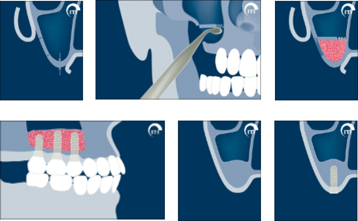 インプラント埋入のために、上顎の奥歯の骨の厚みが足りない場合に骨を作る処置です。もともとの骨の厚みにより、ソケットリフトもしくはサイナスリフトを選択します。骨を作る程度により治療内容や期間はさまざまです。