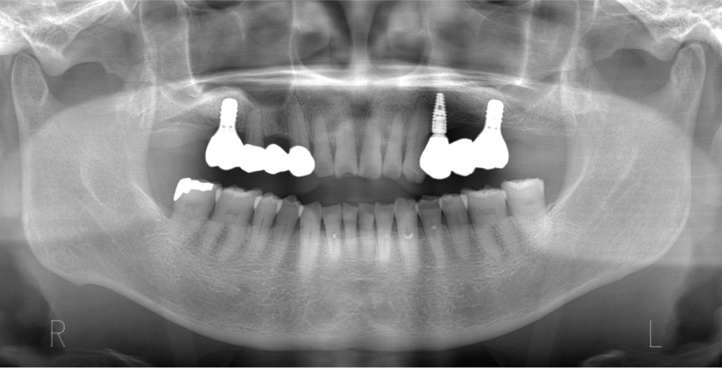 上顎の骨を持ち上げて同時にインプラントを埋入しました。